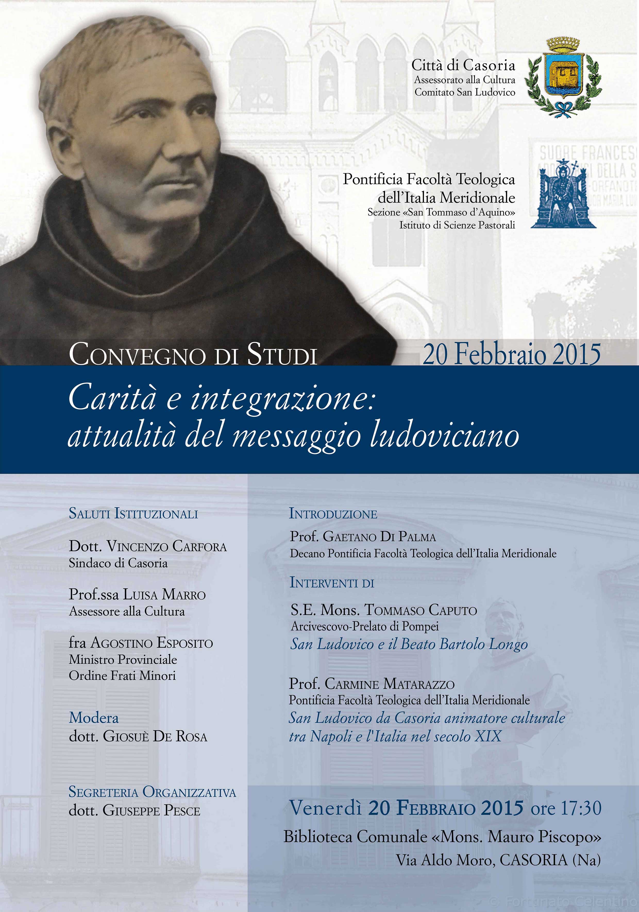 Venerdì 20 febbraio, si terrà a Casoria il convegno di studi “Carità e integrazione: attualità del messaggio ludoviciano”, promosso e organizzato dalla città di Casoria, in collaborazione con la Pontificia Facoltà Teologica dell’Italia Meridionale – Sezione San Tommaso d’Aquino.