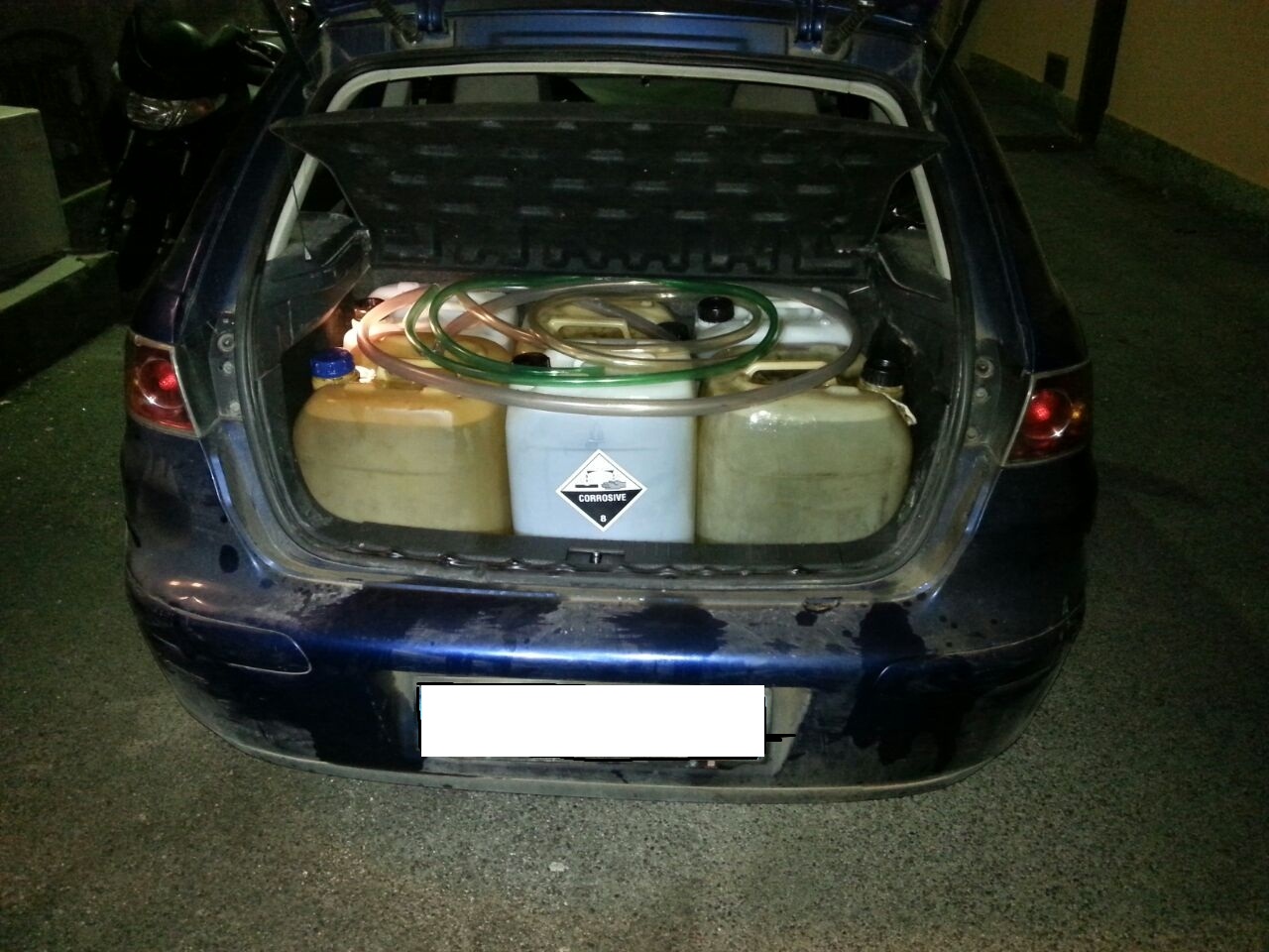 Sequestrate all’interno dell’autovettura ben 15 taniche in plastica contenenti 300 litri di gasolio, oltre a vari tubi in gomma utilizzati per il travaso del gasolio.