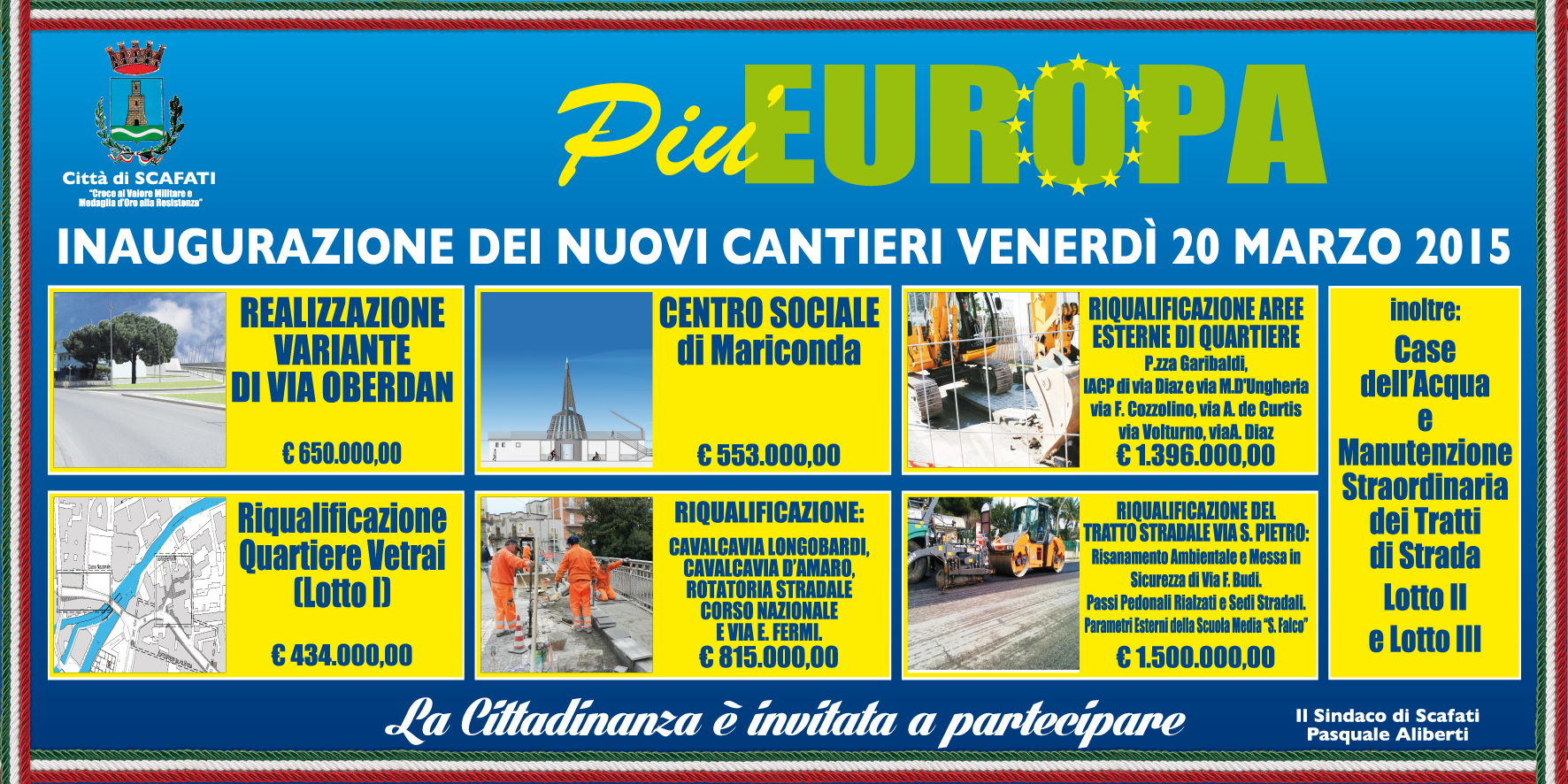Saranno inaugurate il giorno 20 marzo 2015 nuovi cantieri nella Città di Scafati per la realizzazione delle seguenti opere pubbliche: