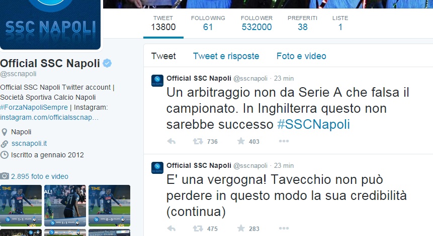 “Un arbitraggio non da Serie A che falsa il campionato. In Inghilterra questo non sarebbe successo #SSCNapoli” questo il primo tweet della SSC Napoli contro la Lega calcio e il sistema arbitrale, ecco il secondo Tweet: “E’ una vergogna! Tavecchio non può perdere in questo modo la sua credibilità”.