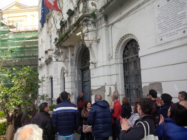 Sono decisi ad attendere il primo cittadino Cuomo barricatosi per tutta la giornata nel palazzo senza far pervenire sue notizie o commenti. In questo momento, alle 16, le forze dell’ordine stanno organizzando un cordone di sicurezza per consentire l’uscita ai politici dal Municipio.