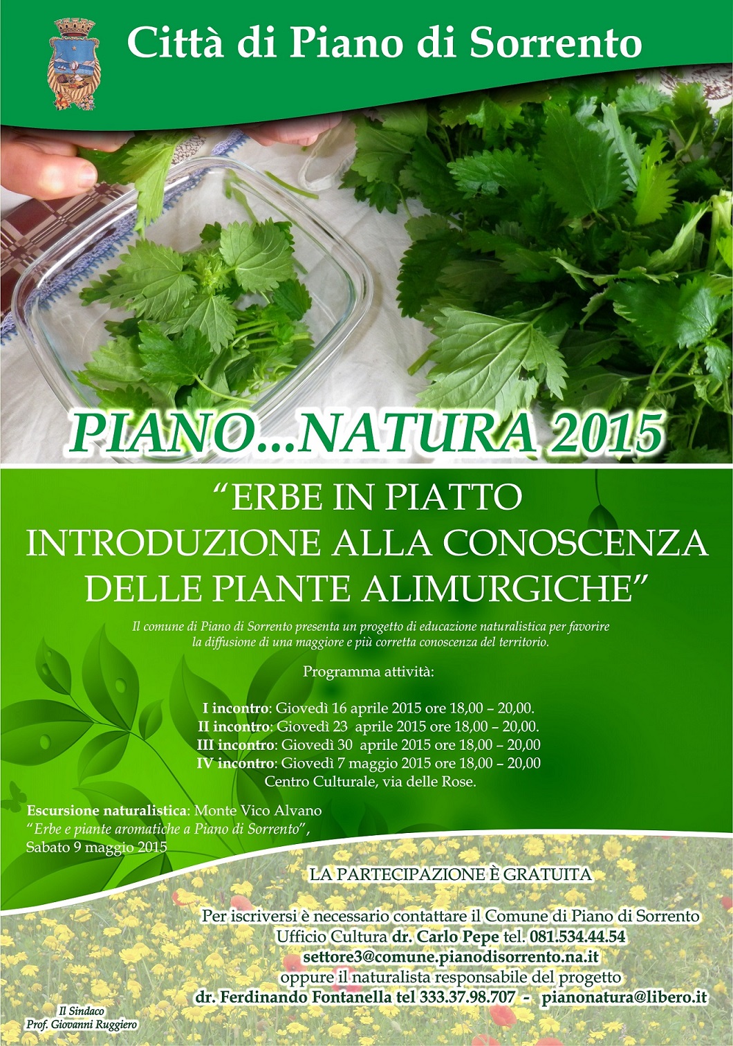 Partirà domani, giovedì 16 aprile alle ore 18.00 presso il centro culturale di Via delle Rose, il progetto “Piano Natura” 2015 promosso dalla Città di Piano di Sorrento, quest’anno sul tema “Erbe in piatto – Introduzione alla conoscenza delle piante alimurgiche”. Si rinnova così l’appuntamento con l’educazione naturalistica in Penisola Sorrentina per favorire la diffusione di una maggiore e più corretta conoscenza del territorio, sulla scia del grande interesse riscosso nelle edizioni precedenti dal progetto “Piano Natura”.