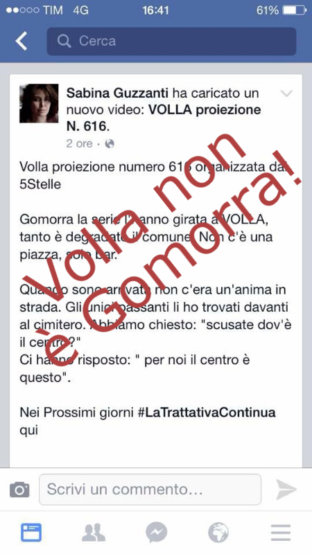 Qualche giorno fa Volla ha avuto il “piacere” di ospitare Sabina Guzzanti invitata dal Movimento 5Stelle locale. Il giorno dopo sul suo sito ufficiale è apparso questo commento “Volla proiezione numero 616 organizzata dai 5Stelle. Gomorra la serie l’hanno girata a Volla, tanto è degradato il comune. Non c’è una piazza, solo bar”.