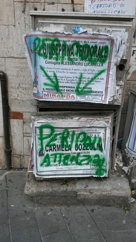 Periodo elettorale ormai in dirittura d’arrivo a Ercolano: non male ma peggio. Non si è mai vista in passato una campagna elettorale per le amministrative locali tanto macchiata da episodi violenti e da calunnie continuamente messe in essere contro candidati ed esponenti politici indigeni. Non ci si è fermati neanche dinnanzi a manifesti funebri identificativi: nella foto a sinistra su due manifesti campeggiano le scritte “pericolo”, “attenzione” e due frecce verso il nome della ditta di onoranze funebre omonima di uno dei candidati a sindaco. Senza dimenticare auto bruciate, comitati presi di mira da balordi, veicoli danneggiati, cumuli di manifesti elettorali strappati a danno dell’immagine locale rappresentano concretamente il clima d’odio nel quale Ercolano si sta preparando ad andare alle urne.
