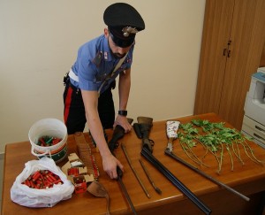 terreno agricolo di pertinenza dell’abitazione, venivano rinvenute 8 piante di canapa indica (altezza dai 50 ai 70 cm) e, nascosti in un bidone di plastica nei pressi della coltivazione dello stupefacente, sono stati rinvenuti 288 cartucce a pallini, di vario calibro, per fucile e 3 fucili da caccia (un calibro20, un calibro 36 e un calibro 8).