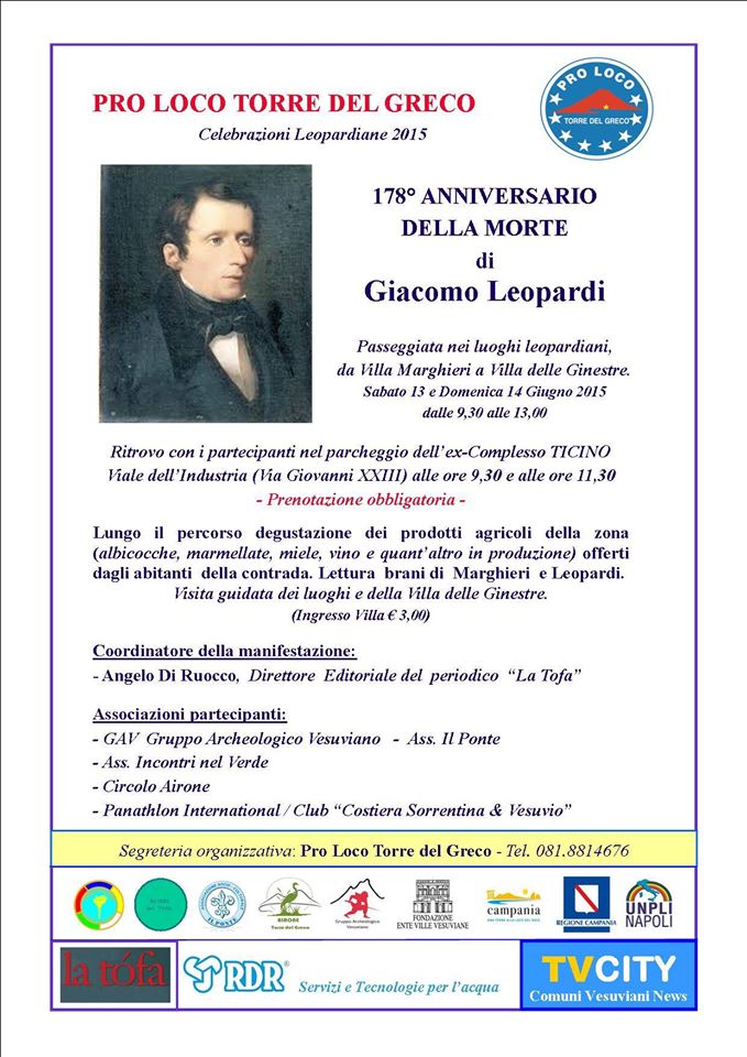 “In occasione del 178° anniversario della morte di Giacomo Leopardi, la Pro Loco di Torre del Greco propone una passeggiata nei luoghi che videro il poeta camminare, meditare, scrivere, raccontare….