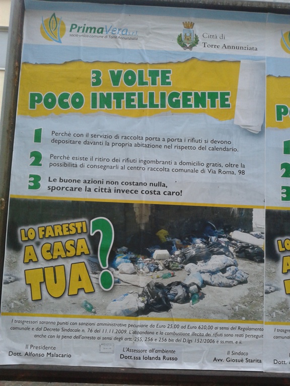 Infatti, ci saranno multe molto salate per i trasgressori che possono arrivare fino a 620 euro, anche se, però, si parte da un minimo di 25 euro. I firmatari del manifesto (il Sindaco Starita, l’Assessore Russo e il dott. Malacario presidente di Prima Vera società che gestisce il ciclo rifiuti) attaccano, in maniera molto diretta, quei cittadini che non rispettano prima di tutto la raccolta porta a porta e, inoltre, lasciano in zone isolate quei rifiuti pesanti che possono essere tranquillamente ritirati sotto casa dagli organi preposti. “Tre volte poco inteliggente, perchè col il servizio porta a porta i rifiuti si devono depositare davanti la propria abitazione secondo il calendario, perchè esiste il servizio gratuito per i rifiuti ingombranti oltre alla possibilità di depositarli al centro raccolta, perchè le buone azioni non costa nulla invece sporcare la città costa caro!”. Ed infine l’ultima ‘stoccata’: una foto di un cumulo di rifiuti e la scritta “lo faresti a casa tua?”. Questi i punti salienti del manifesto-provocazione per smuovere le coscienze dei cittadini torresi. Seguendo questi punti, si potrebbe rendere una città molto più vivibile per tutti i cittadini, dando un forte esempio di civiltà.