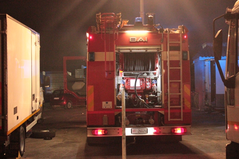 Le fiamme si estendono velocemente tra i vari materiali presenti nelle rimesse e nelle officine della struttura, divorando mezzi, veicoli e strumenti industriali.