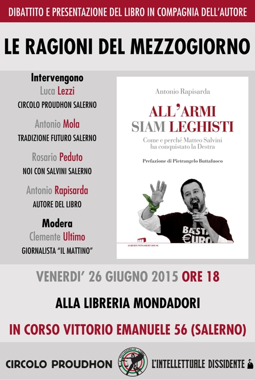 Salerno, 23 giugno. Si terrà venerdì 26 giugno alle ore 18 presso i locali della libreria Mondadori in corso Vittorio Emanuele 56 a Salerno la presentazione del libro “All’armi siam leghisti” di Antonio Rapisarda organizzata dal locale Circolo Proudhon e dall’associazione culturale Tradizione Futuro.
