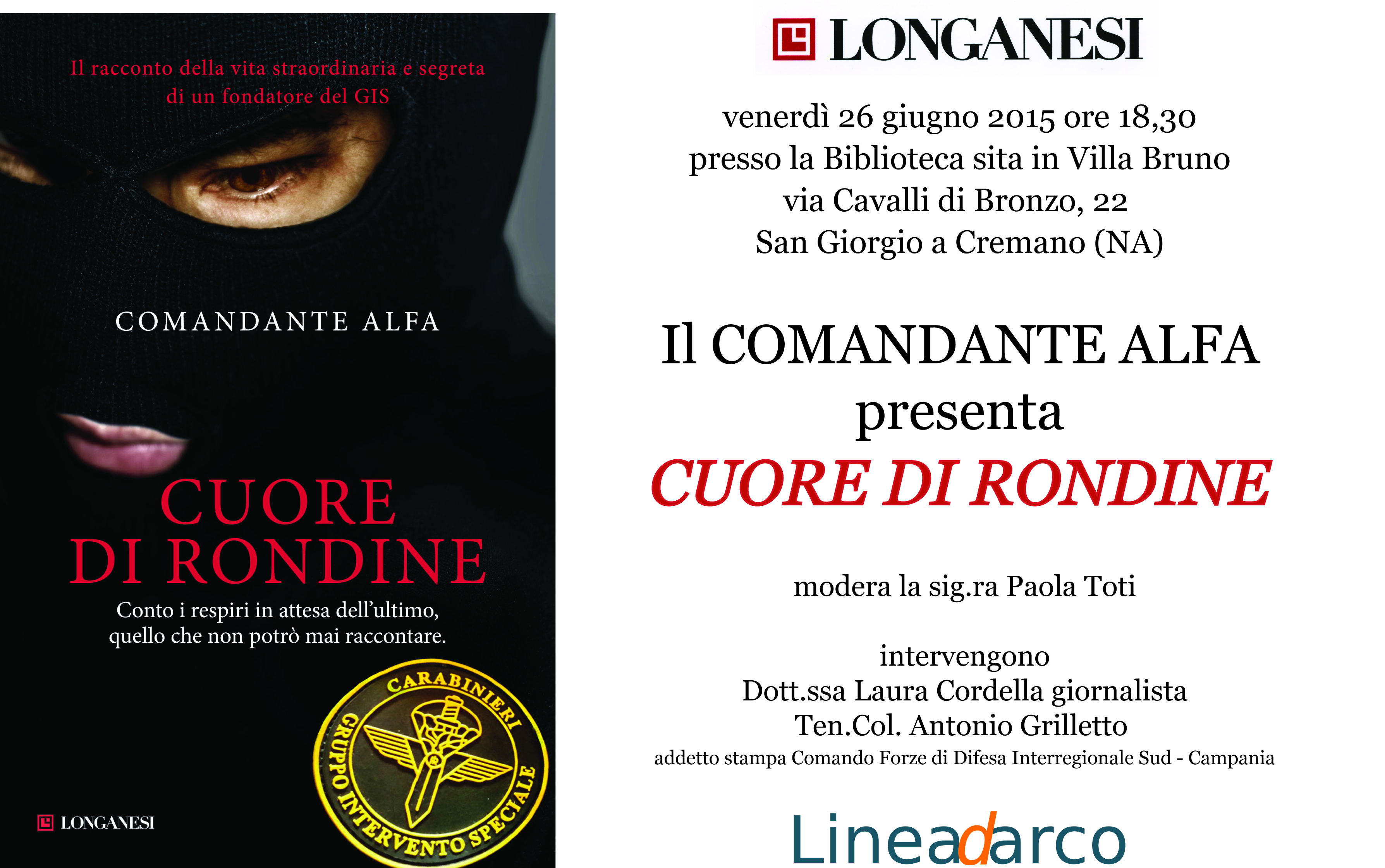 Venerdì 26 giugno2015 alle ore 18,30 presso la Biblioteca di Villa Bruno- via Cavalli di Bronzo, 22 – San Giorgio a Cremano si svolgerà la presentazione ufficiale del libro “ Cuore di rondine”. L’autore,il Comandante Alfa è lo pseudonimo sotto cui si nasconde l’identità di uno dei fondatori del G.I.S., il Gruppo di Intervento Speciale dell’Arma dei Carabinieri. Ill Comandante Alfa è uno dei fondatori del GIS (Gruppo intervento speciale), reparto d’élite dell’Arma dei Carabinieri.