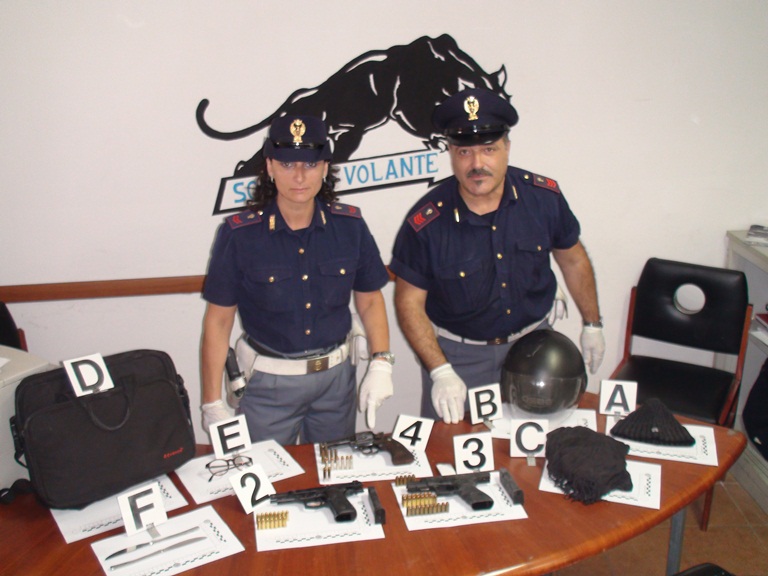 I poliziotti hanno sottoposto a sequestro l’autovettura ed il contenuto del borsone: due pistole, una semi automatica cal.9 parabellum con relativo