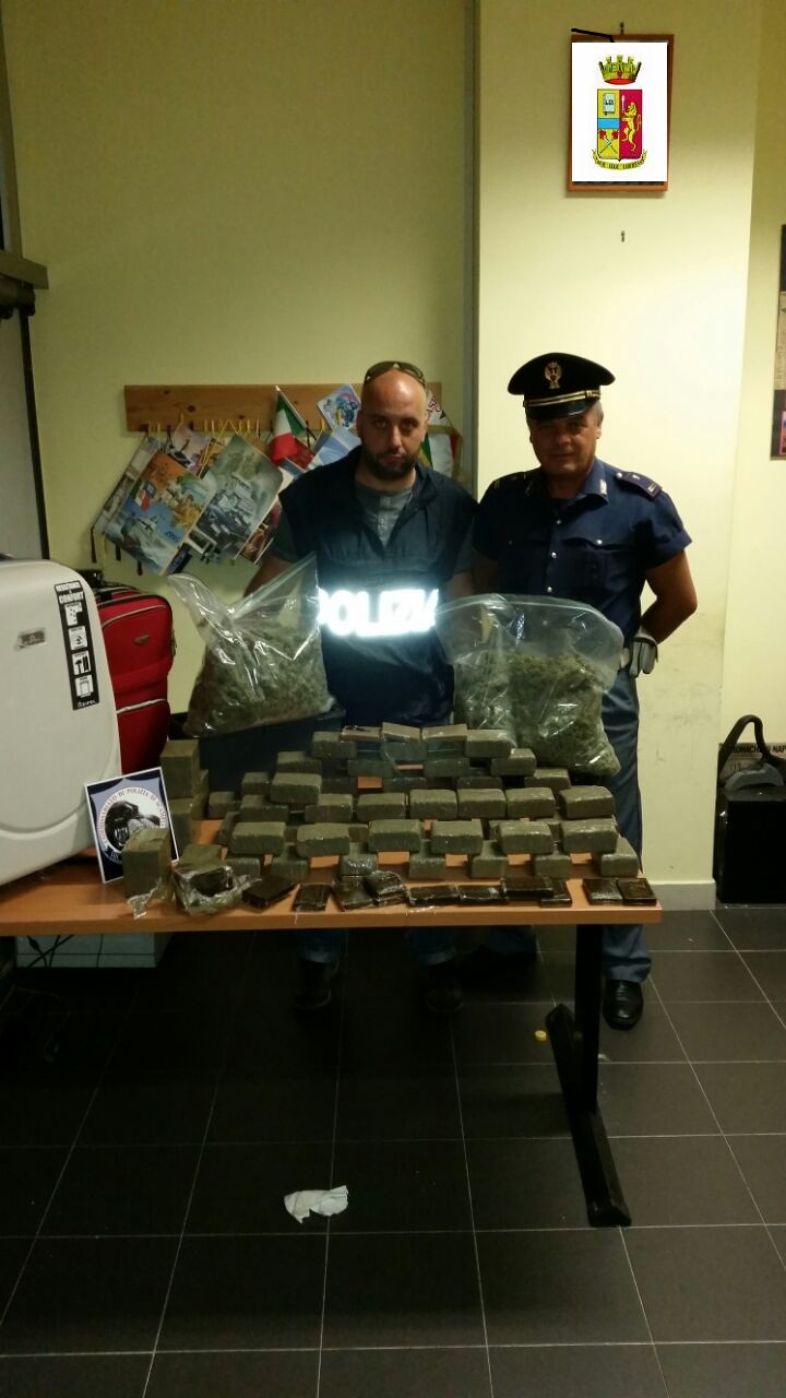 Nella valigia che portava Gennaro Faraco gli agenti hanno trovato due sacchetti di plastica trasparente contenente poco più di 2,1 chilogrammi di marijuana.