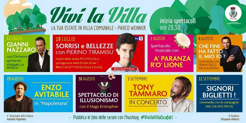 Tra gli ospiti delle serate Gianni Nazzaro, Pierino Tiramisù, Antonio O’ Lione Matrone e la sua Paranza, Francesco Paolantoni, Enzo Avitabile e Tony Tammaro. E’ stato lanciato ufficialmente anche l’hashtag ufficiale per condividere foto e contenuti : #VivilaVillaScafati