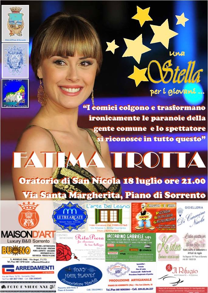 A Piano di Sorrento ritorna l’appuntamento estivo con “Una Stella per i Giovani”. Dopo Claudia Koll (premiata nel 2008), Veronica Maya (2012) e Gianluca di Gennaro (2014), il prossimo sabato 18 luglio alle ore 20.30, nella splendida cornice dell’Oratorio di San Nicola, sarà la volta di un altro personaggio molto apprezzato dal pubblico: Fatima Trotta.