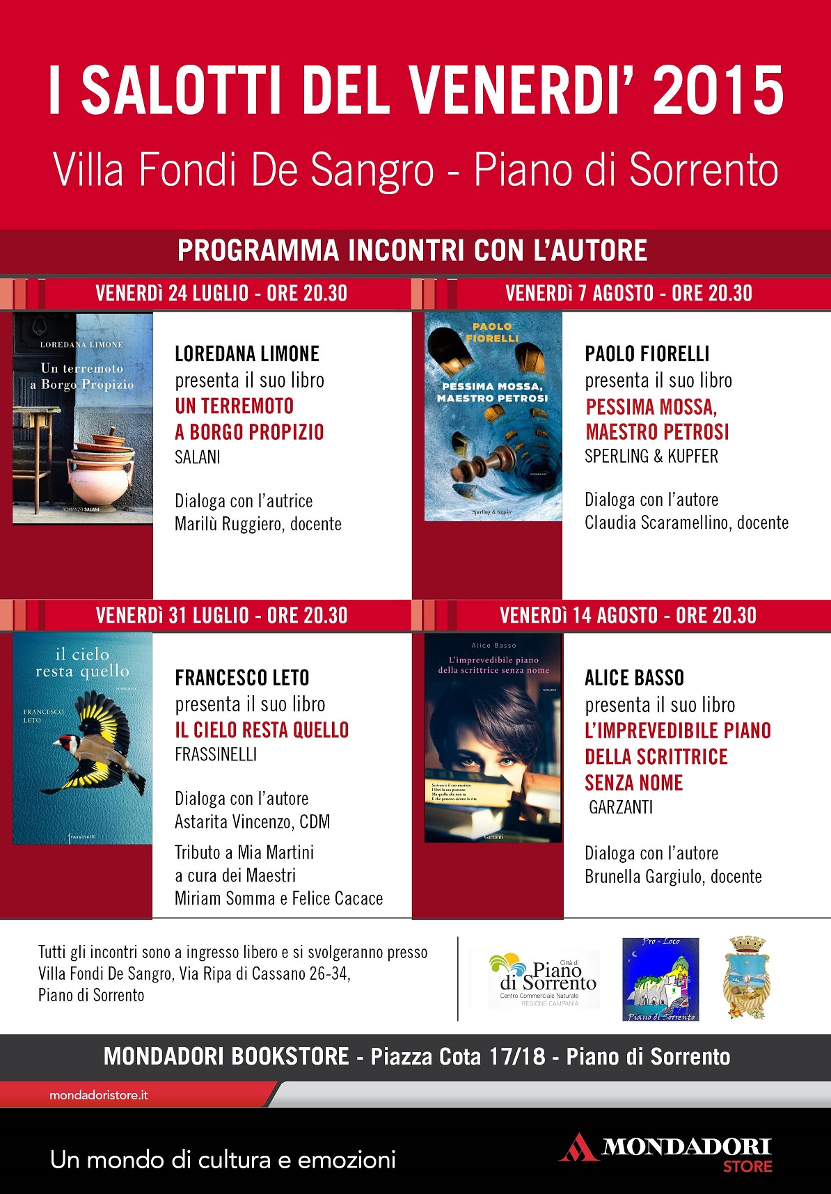 Continua la rassegna dei Salotti letterari della Città di Piano di Sorrento inserita nella Summertime 2015, il cartellone degli eventi estivi carottesi, e curata questa volta dalla Libreria Mondadori con il patrocinio del Comune, dell’Associazione Turistica Pro Loco e del Centro Commerciale Naturale. Quattro appuntamenti, a cavallo dei mesi di luglio e agosto, che si terranno alle 20.30 a Villa Fondi.