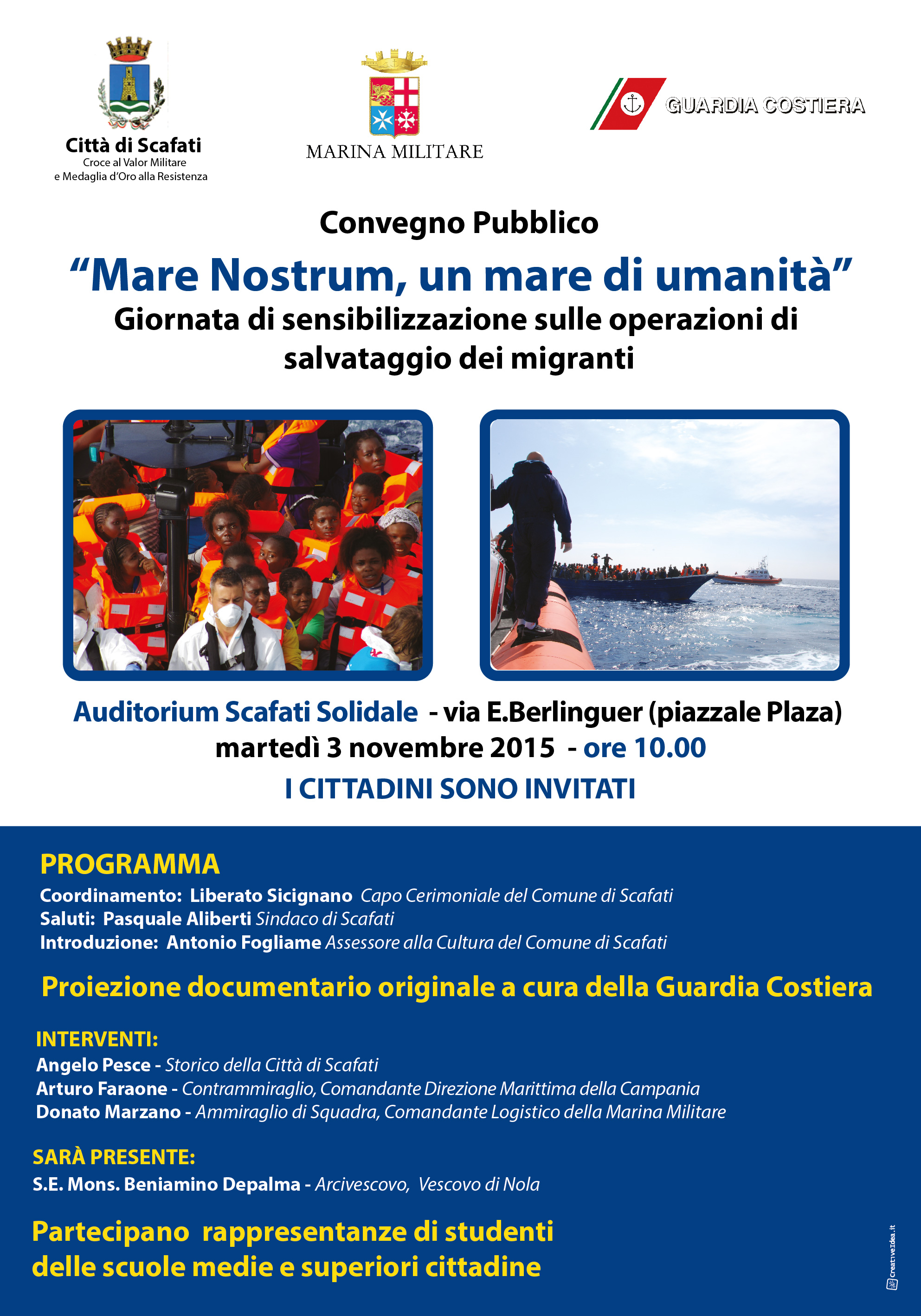 E’ organizzato per il giorno 3 novembre 2015 alle ore 10 presso l’Auditorium dell’Istituzione Scafati Solidale il convegno pubblico “Mare Nostrum, un mare di umanità”, un incontro per sensibilizzare sulle operazioni di salvataggio dei migranti.