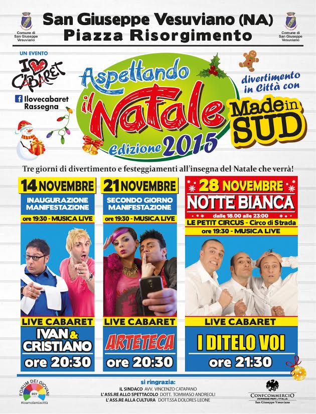 comuni limitrofi per indicare San Giuseppe Vesuviano come meta del divertimento e punto di aggregazione per giovani e famiglie. Abbiamo selezionato attrazioni che potessero essere espressione di tutte le fasce d’età, con una particolare propensione alla scelta di gruppi live dal repertorio frizzante oltre ai maggiori comici provenienti dalla nota trasmissione Rai “Made in Sud”, record di ascolti nell’ambito delle trasmissioni comiche nazionali. Abbiamo inoltre completato il programma concludendo con una “notte bianca” format ormai diffuso ed apprezzato in tutta Europa, per vivere la notte e proporre formule commerciali alternative. Intrattenimento con la compagnia di circo di strada “Petit Circus” dalle 18.00