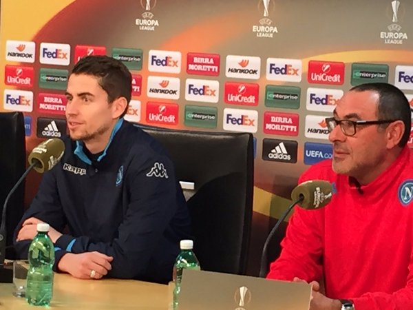 Il tecnico del Napoli, Maurizio Sarri e il centrocampista azzurro Jorginho, parlano in Conferenza Stampa alla vigilia del match di Europa League, contro il Legia Varsavia, ultimo atto di un girone strepitoso per i partenopei.