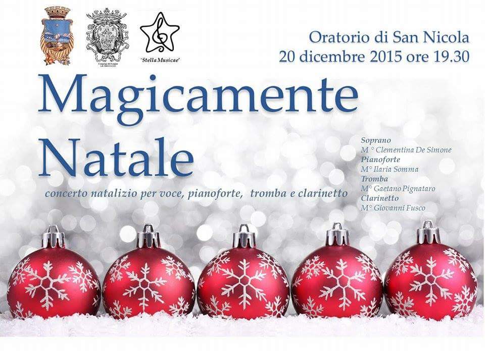 Infine presso l’Oratorio di San Nicola alle 19.30 si terrà il concerto natalizio “Magicamente Natale” con i Maestri Clementina De Simone, soprano, Ilaria Somma al pianoforte, Gaetano Pignataro alla tromba e Giovanni Fusco al clarinetto.