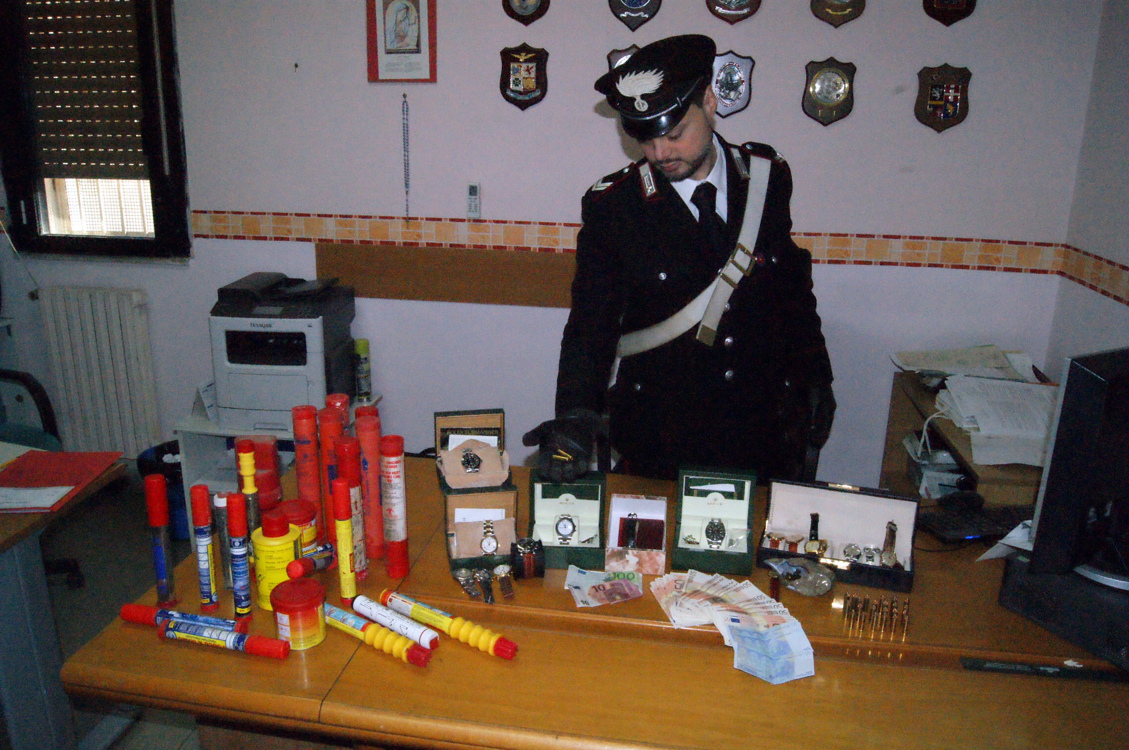 Quattro rolex, 9 orologi di lusso (per un valore di 40.000€), 4 moto d’epoca rubate (per un valore di 10.000€), 35 cartucce calibro 38, 40