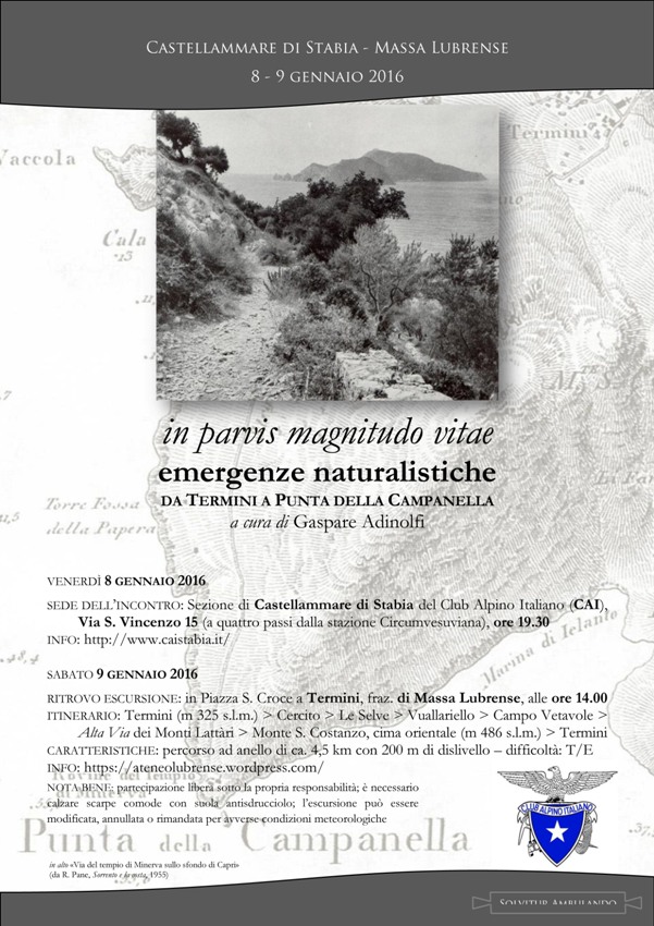 Ospite della serata lo studioso e appassionato di territorio Gaspare Adinolfi, che così descrive il suo intervento: “Parlerò di Anfibi caudati e senza coda, rapaci diurni e avifauna migratrice, arbusti endemici e orchidee spontanee, piante alofile ed entità di interesse comunitario, animali minacciati dall’uomo e specie già estinte, o in via di estinzione, ed altro ancora; insomma delle ripercussioni delle attività antropiche, in particolare del progetto di «Restauro manufatti e abbattimento barriere architettoniche Via Campanella», che volge al termine, sulle Emergenze naturalistiche da Termini a Punta della Campanella (Massa Lubrense) alcune delle quali inedite o ignote alla comunità scientifica.