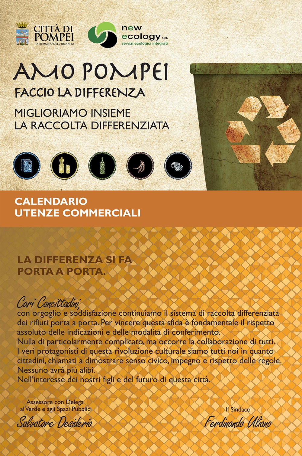 “Il nuovo calendario – dichiara Umberto Ponzo, amministratore della New Ecology – è il risultato di un approfondito studio statistico sui potenziali modelli comportamentali, in ragione delle abitudini della popolazione pompeiana e della composizione chimica delle singole frazioni merceologiche. Come elemento di unione del sistema tra cittadino che conferisce e azienda che raccoglie, si è cercato di andare incontro ai cittadini. L’obiettivo perseguito è quello di limitare e semplificare ogni adempimento dell’utenza, dalla separazione alla detenzione e da quest’ultima al conferimento”.