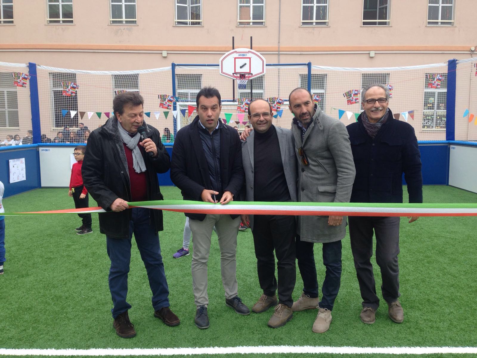 Festa grande all’istituto comprensivo Sauro-Morelli di via Circumvallazione per l’inaugurazione del campetto sportivo polivalente acquistato dall’amministrazione comunale guidata dal sindaco Ciro Borriello e sistemato negli spazi adiacenti la struttura scolastica. Oltre 150 bambini iscritti alle elementari, coordinati dai loro professori e sotto lo sguardo attento del dirigente scolastico, Gennaro Di Martino, hanno preso parte all’evento sportivo seguito al taglio del nastro, effettuato dal consigliere comunale Luigi Caldarola, fautore dell’iniziativa, alla presenza tra gli altri dell’assessore agli Eventi, Ferdinando Guarino; del consigliere comunale delegato allo Sport, Vittorio De Carlo; dei dipendenti dell’ufficio Sport.