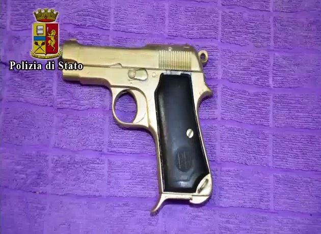 i poliziotti, hanno scoperto all’interno del vano cassonetto della tapparella del salone, una pistola Beretta cal. mm9 corto con matricola abrasa e 57 cartucce cal. 380auto.