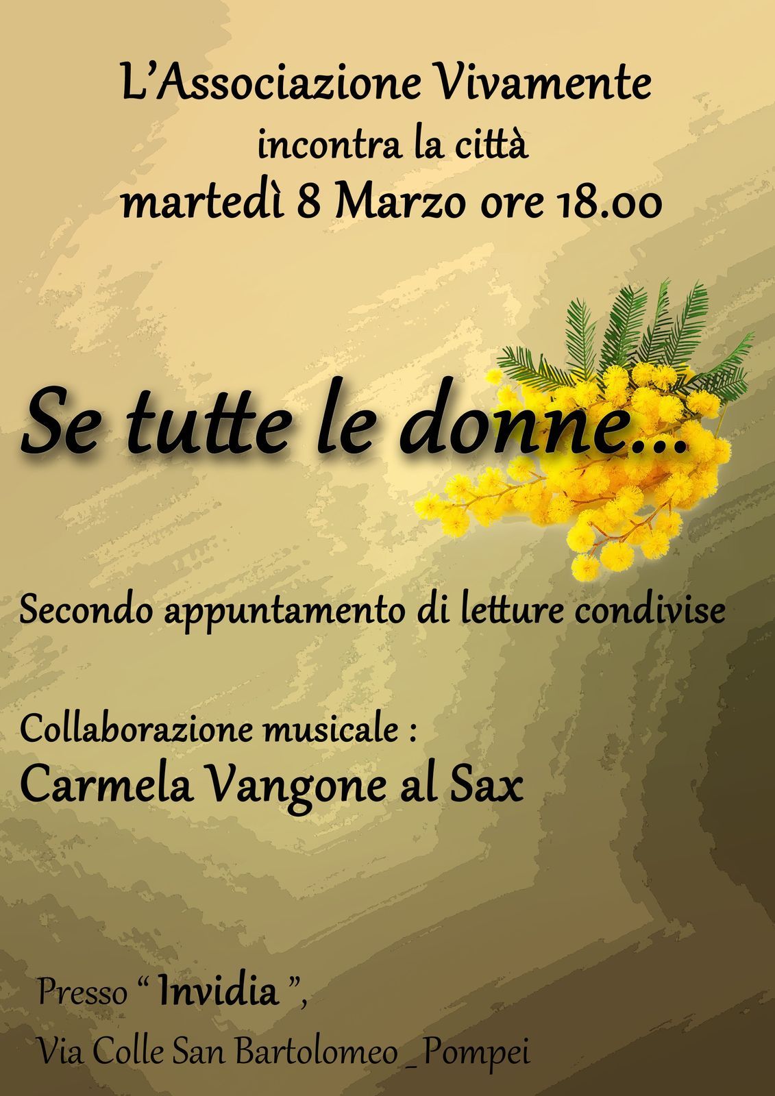 Martedì 8 marzo, in occasione della Giornata internazionale della Festa della Donna, l’associazione “VIVAMENTE” organizza alle ore 18 il secondo appuntamento di letture condivise presso l’”Invidia”, il locale di Via Colle San Bartolomeo a Pompei.