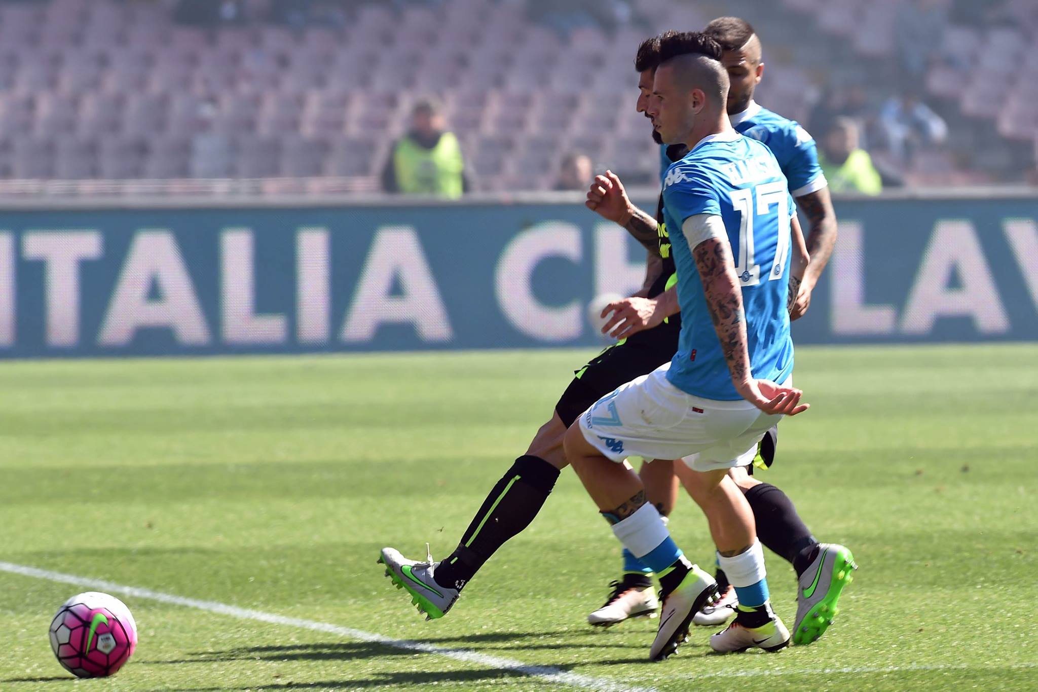 Napoli sul velluto contro il Verona, scrollate di dosso polemiche e scorie della scorsa settimana gli azzurri abbattono gli scaligeri 3 a 0 senza subire nemmeno un tiro in porta. Il tutto nonostante le squalifiche e le defezioni per il team di Sarri. Callejon e Hamsik i migliori in campo. Ultrà azzurri con la maschera di Higuain per mostrare vicinanza al bomber del campionato squalificato per 4 turni dal giudice sportivo. Avversari rinunciatari