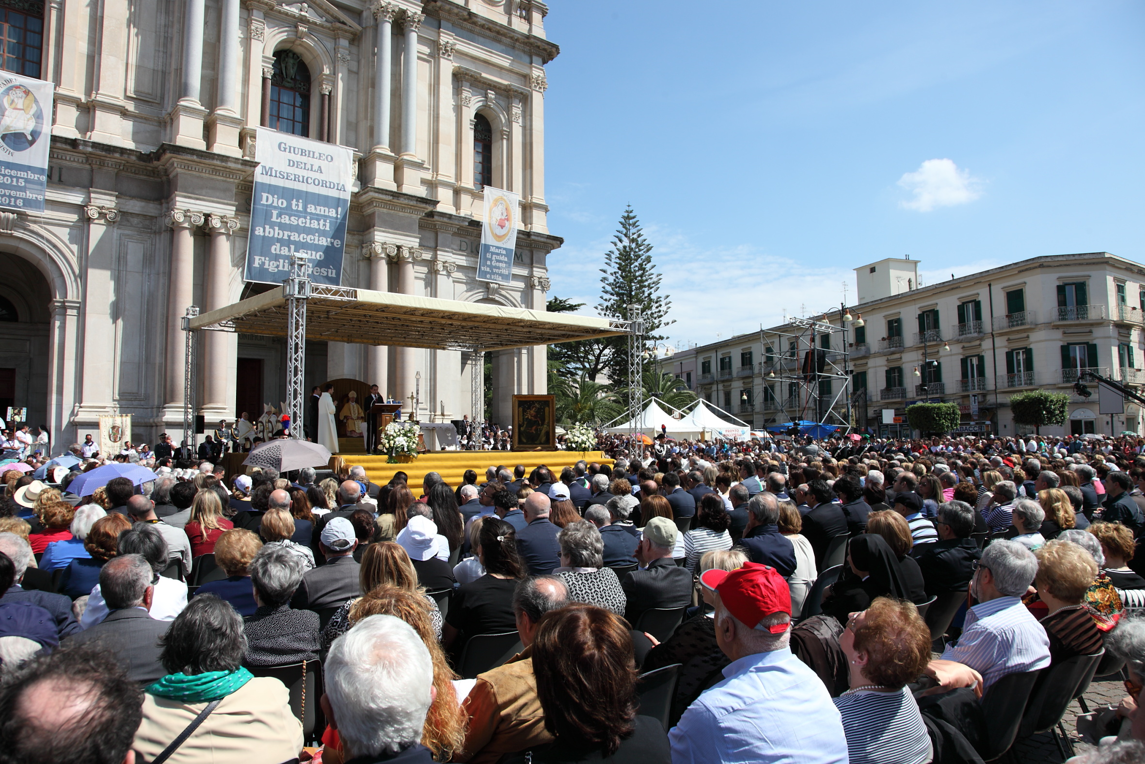 Si è ripetuto a Pompei l’appuntamento con “l’Ora del mondo”, così come definiva il Fondatore del Santuario, il Beato Bartolo Longo, il mezzogiorno dell’8 maggio. Nella giornata in cui la Chiesa universale celebra l’Ascensione di Gesù al cielo, migliaia di pellegrini hanno affollato il sagrato della Basilica mariana per invocare la Beata Vergine del Santo Rosario nella recita della Supplica, quest’anno guidata dal Cardinale Gianfranco Ravasi, Presidente del Pontificio Consiglio della Cultura e della Pontificia Commissione di Archeologia Sacra. Pompei ha invocato ancora una volta la “Sovrana del Cielo e della Terra”, chiedendole di rivolgere il suo “sguardo pietoso” su ogni uomo, sulle “famiglie, sull’Italia, sull’Europa, sul mondo”. Il Cardinale Ravasi, nell’omelia della celebrazione Eucaristica che ha preceduto la Supplica, si è soffermato proprio sulla parola “sguardo”, utilizzando l’immagine degli occhi. «Sono uno degli strumenti fondamentali per la nostra comunicazione oltre e dopo la parola. Sono più importanti per certi versi. Due innamorati autentici, quando hanno esaurito la scorta delle loro parole, magari ripetute, se sono innamorati davvero, si guardano negli occhi e tacciono. E quel linguaggio muto, silenzioso, è molto più intenso di quelle parole che prima si pronunciavano». Continuando a servirsi dell’immagine degli occhi, il Cardinale ne ha spiegato la duplice direzione: verso l’alto, cioè verso Dio, e verso il basso, cioè verso l’uomo. «Siamo invitati – ha spiegato – a rivolgere uno sguardo verso l’alto, verso l’infinito tutto. Questo sguardo rivolto oltre l’orizzonte concreto in cui siamo immersi c’insegna che il fiume della nostra vita, dopo aver percorso le varie anse, non ha un abisso di vuoto, un gorgo oscuro in cui si perde. Ha invece una mèta, una luce. (…). Quest’itinerario ha un oltre, che è nella luce, non è nella tenebra e nel vuoto». E da ciò che nasce la speranza dei credenti. «La parola che io vorrei lasciarvi e che voi cercate, direttamente o indirettamente, qui a Pompei è la parola speranza. (…). Un poeta francese diceva che la speranza ci conduce, prende per mano la fede e la carità e fa andare avanti, oltre le fatiche della vita. (…). Qui a Pompei tutti i pellegrini vengono per sentirsi dire quella parola, che avete sentito tante volte ed era cara anche a San Giovanni Paolo II: “non abbiate paura”, “non temete”. Pensate, nella Bibbia, questa parola risuona 365 volte. È un po’ come il buongiorno che Dio vi rivolge ogni mattina. Anche quando la mattina è tenebrosa e non è come questa giornata. Anche quando dentro di voi c’è la desolazione. Non abbiate paura. La speranza vi indica la mèta ultima che l’Ascensione di Cristo rappresenta». Il Cardinale Ravasi ha continuato a rivelare i sensi della parola “sguardo”, che può anche essere rivolto verso il basso, sulla strada, sulle pietre, sulla “polvere della terra”. «Diceva un poeta: guardate le pietre che sono sulla terra. Esse portano ancora le orme insanguinate del Cristo che sta passando per le nostre strade. (…)». Il pensiero del celebrante è ad esempio alle strade insanguinate della Siria, della città di Aleppo in particolare, che spiega di conoscere bene. «Ma tante volte, anche nella nostra terra il sangue è lasciato dalla violenza», ha detto ancora. «Lo sguardo verso il basso significa: ritornate ancora a guardare. Pensiamo in quante case, anche in questo momento, c’è per esempio la solitudine assoluta, il silenzio, il non avere più una persona che si ricordi di te, che ti dia uno squillo di telefono, che ti faccia una carezza. E c’è la separazione, la divisione, la lacerazione. O ci sono genitori che vivono nel terrore per i figli che hanno imboccato delle strade di perdizione, travolti dalla droga, dalla violenza, dalla disperazione o anche dall’impossibilità di trovare lavoro. Ecco perché l’invito del cristianesimo è un invito alla carne. Il Verbo si è fatto carne. È un invito ad entrare nella storia. C’è questa parola che viene ripetuta continuamente: siate testimoni della vostra speranza, della vostra fede. Vorrei ricordare in questo momento una frase di un giudice che è stato ucciso dalla mafia, Rosario Livatino, di cui è in corso la causa di beatificazione: “Non basta essere credenti, bisogna essere anche credibili”». Proprio Pompei è casa di uno sguardo capace di guardare a Dio e, nel contempo, alla sofferenza dell’uomo. È uno sguardo coinvolto, partecipe, non indifferente. Nel saluto al Cardinale Ravasi, l’Arcivescovo di Pompei, monsignor Tommaso Caputo ha ricordato che «accanto al tempio della fede, il nostro Fondatore, il Beato Bartolo Longo, volle realizzare anche il tempio della carità, quel complesso di opere sociali che, come una corona di rose, circondano il trono della Vergine per renderle lode e ringraziarla per aver scelto questa terra per spargere il suo amore”. Opere sociali che, nel segno del carisma del Beato, proseguono, con forme diverse, l’attività di servizio a favore dei bisognosi. «Sono attualmente operativi – ha proseguito il Prelato – due Centri Diurni per circa 200 ragazze e ragazzi dai 6 ai 18 anni; la “Casa Emanuel” per ragazze madri e donne sfuggite a situazioni di violenza familiare; il Consultorio Familiare; gli ambulatori materno e infantile per famiglie disagiate; il Centro di Aiuto alla Vita e Movimento per la Vita, una casa di riposo per anziane; un Centro per il recupero di ex tossicodipendenti. Ed anche un Centro, dove dal mese di aprile si accolgono donne migranti con i loro bambini. Il Centro per il Bambino e la Famiglia “Giovanni Paolo II” sorto all’interno delle ex-case operaie, ospita cinque Case Famiglia, che accolgono bambini, giovani donne con problemi, adolescenti, anziani, diversamente abili. Nella Casa del Pellegrino è in funzione la Mensa quotidiana per i Poveri. Al termine de