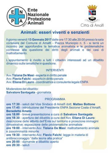 Diritti degli animali, animalismo, criminalità minorile connessa a maltrattamenti animali, antibracconaggio sono gli argomenti che saranno trattati nell’incontro “Animali: esseri viventi e senzienti” in programma venerdì 13 gennaio alle 17.30 presso l’Aula Consiliare del Comune di Amalfi.