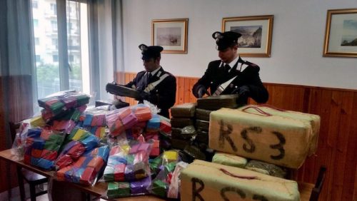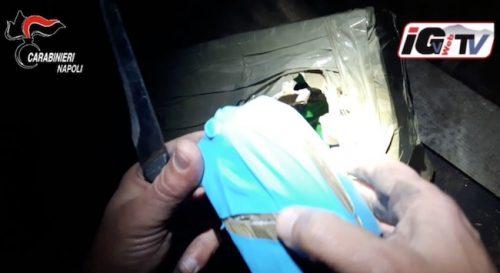 L’ingente quantitativo, destinato a rifornire i gruppi criminali della provincia di Napoli, era contenuto in sacchi di juta. I panetti erano ricoperti di gomma per ingannare il fiuto dei cani antidroga.
