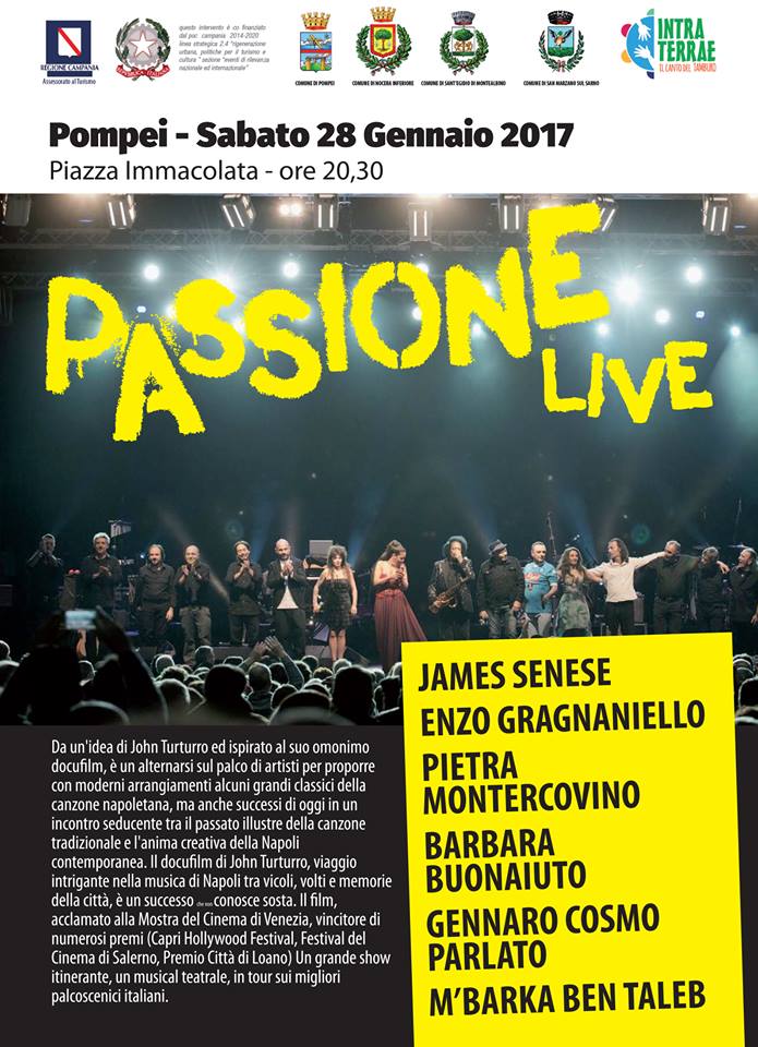 Da un’idea di John Turturro ed ispirato al suo omonimo docu-film, la “Passione Live” è un alternarsi sul palco di artisti per proporre con moderni arrangiamenti alcuni grandi classici della canzone napoletana, ma anche successi di oggi in un incontro seducente tra il passato illustre della canzone tradizionale e l’anima creativa della Napoli contemporanea.