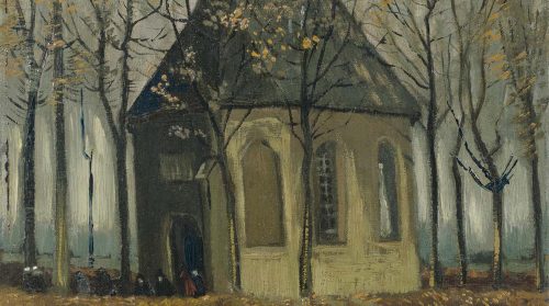 Eseguita per la madre all’inizio del 1884, la tela mostra infatti la chiesa del villaggio di Nuenen dove il padre di Van Gogh era stato pastore. Nel 1885, dopo la morte di questi, il pittore ha modificato il dipinto aggiungendo il gruppo di fedeli in primo piano, in sostituzione di una precedente figura isolata di contadino, e foglie brune sugli alberi per restituire un clima più autunnale”.