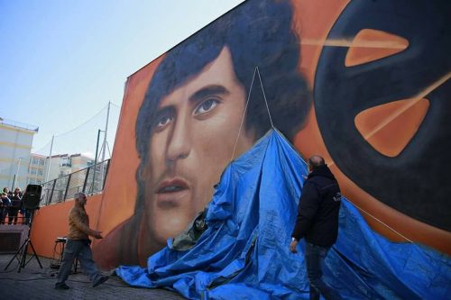 In via Galdieri sul muro perimetrale del Palaveliero, alla presenza di moltissimi cittadini e non si è inaugurato il primo murales a lui dedicato voluto dalla Flat Sport e dall’amministrazione comunale e egregiamente realizzato dal grande Jorit Agoch.