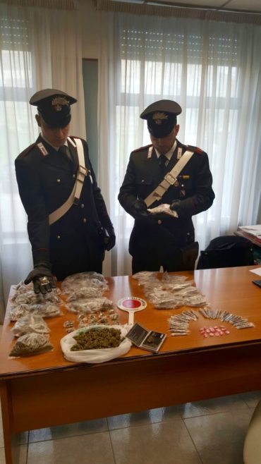 Durante la perquisizione domiciliare i Carabinieri hanno trovato 210 stecche di hashish, 195 dosi di marijuana, una busta con 115 grammi di marijuana e 15 dosi di cocaina.