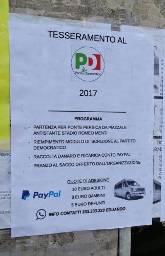 La campagna di tesseramento del Partito Democratico sta creando molta confusione nell’ambiente politico della città di Castellammare di Stabia ma, anche in questi casi, la satira corre veloce sia sul web sia sui muri della città.