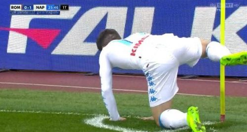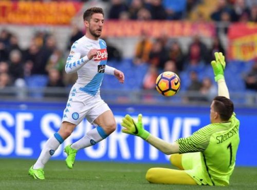Nell’anticipo all’Olimpico della 27/a giornata. Spalletti cambia modulo e torna al 4-2-3-1; sorprese anche nel 4-3-3 di Sarri con Jorginho e Rog titolari. Il primo gol arriva al 26′ con il belga che trova il corridoio giusto, ben imbeccato da Hamsik, e fulmina con un pallonetto Szczesny in uscita. Poi, si esibisce in un’esultanza imitando un cane che fa pipì sulla bandierina del corner.