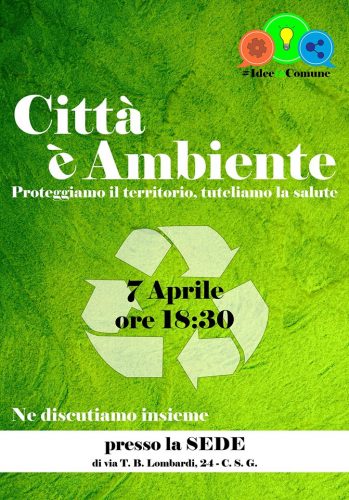 L’incontro si terrà venerdì 7 aprile 2017, dalle ore 18:30, nella sede di #IdeeinComune in Via Tenente Bruno Lombardi a Castel San Giorgio. «Città è Ambiente vuole rappresentare un focus sulla condizione di vita dei cittadini, sull’efficienza dei servizi, perché le capacità di sviluppo – dice l’Avvocato Lanzara – si misurano innanzitutto attraverso la qualità dell’ambiente urbano.