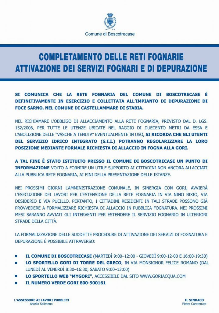 Successivamente, nell’ambito del programma di riqualificazione delle strade comunali, varato dall’amministrazione di Boscotrecase, GORI provvederà alla posa della rete fognaria anche per via Carlo Alberto, via Rivo Carotenuto e via Mortaio Calabrese.