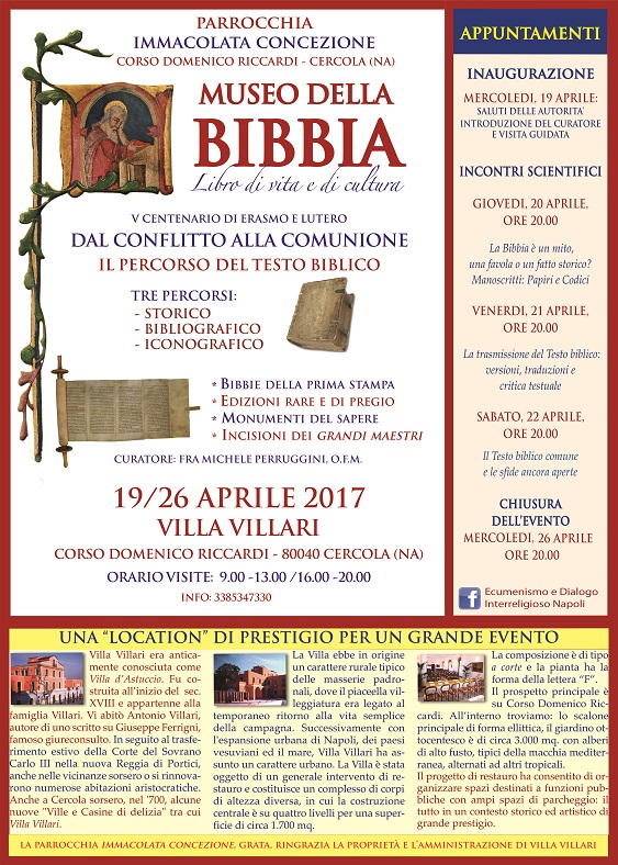 Nel complesso architettonico del XVII secolo noto come Villa Villari sito in Corso Domenico Riccardi Cercola si terrà dal 19 al 26 aprile 2017 la Mostra Biblica. Essa è organizzata dalla Parrocchia Immacolata Concezione con la collaborazione dell’Ufficio per l’Ecumenismo e il Dialogo Interreligioso dell’Arcidiocesi di Napoli di cui il responsabile è il prof. Gaetano Castello, biblista della Pontificia Facoltà Teologica dell’Italia Meridionale. L’occasione della mostra è data dalla Commemorazione dei 500 anni della Riforma Luterana. Essa è curata dal padre francescano Michele Perruggini. Sarà visitabile dalle 09.00 alle 13.00 e dalle 16.00 alle 20.00. Durante i giorni dell’esposizione sono previsti alle ore 20.00 tre incontri scientifici. Il primo incontro sarà il 20 aprile dal tema: La bibbia è un mito, una favola o un fatto storico?