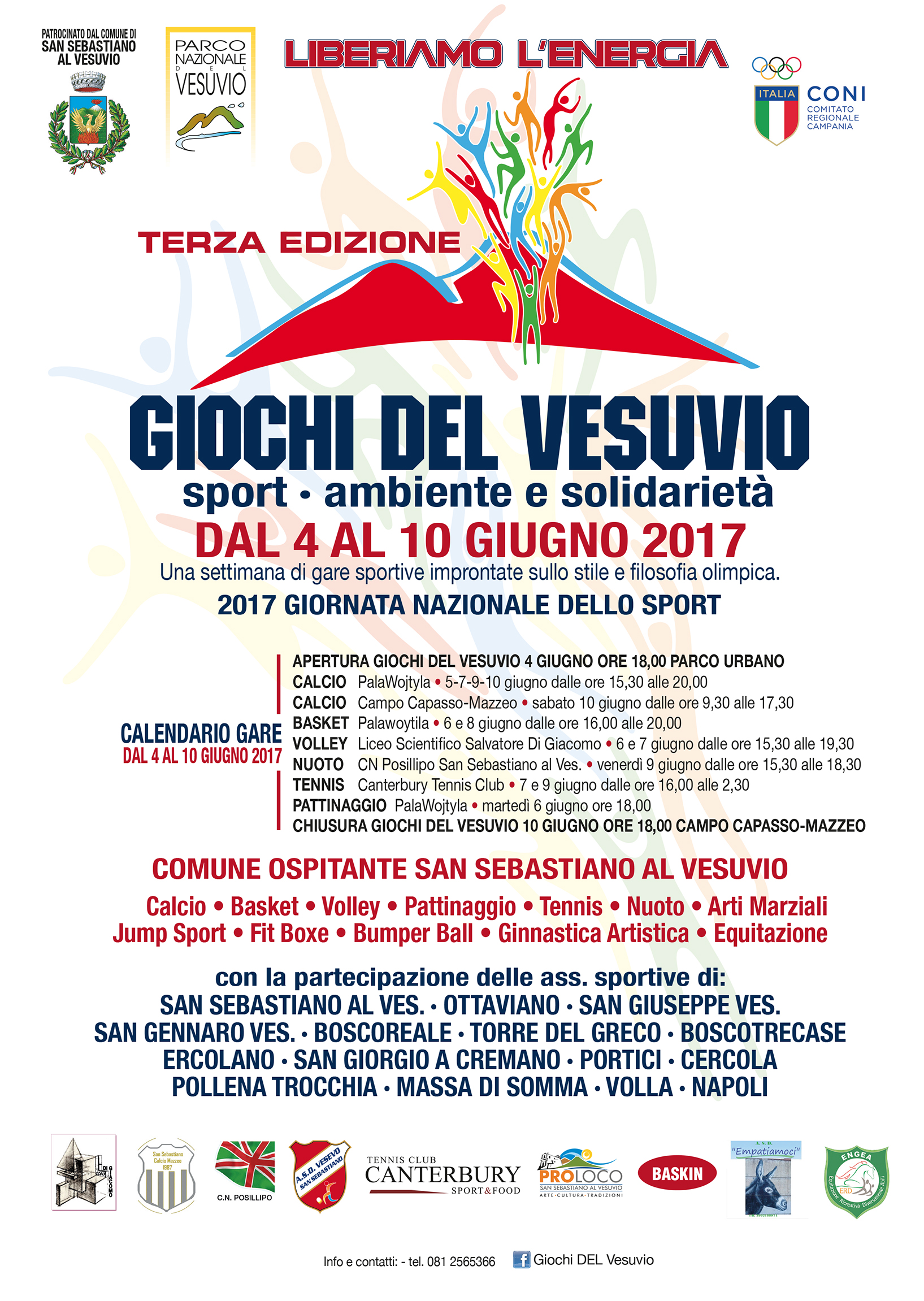 Come sede ospitante dei Giochi che accoglieranno giovani sportivi di numerosi comuni vesuviani – dichiara il sindaco di San Sebastiano, Salvatore Sannino – la nostra cittadina diventerà per una settimana una ‘cittadella dello sport’ senza trascurare il fatto che l’evento assume particolare rilievo anche per lo sviluppo turistico del territorio con un indotto favorevole all’economia ed al prestigio dell’intera comunità. Il fatto che il Parco Nazionale del Vesuvio – sottolinea il vicesindaco con delega allo Sport ed all’Ambiente, Giuseppe Panico – promuoverà un’apposita campagna ambientale rivolta alle nuove generazioni ed il nostro polo liceale che, da quest’anno amplia la sua offerta formativa con l’indirizzo sportivo, ospiterà le gare di volley confermano che i Giochi rappresentano un momento di sensibilizzazione allo sport, ai suoi valori ed alle pratiche ecosostenibili ma anche un’occasione per valorizzare ogni forma di collaborazione tra i soggetti operanti sul territorio.