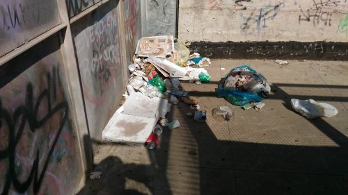Degrado a Pozzuoli: un ponte in metallo che collega Traversa Napoli con la zona residenziale della città che confina con Bagnoli perennemente trasformato in discarica a cielo aperto, con tanto di rifiuti alimentari sparsi a terra sul manto di cemento che fungono da irresistibile richiamo per ratti e insetti.