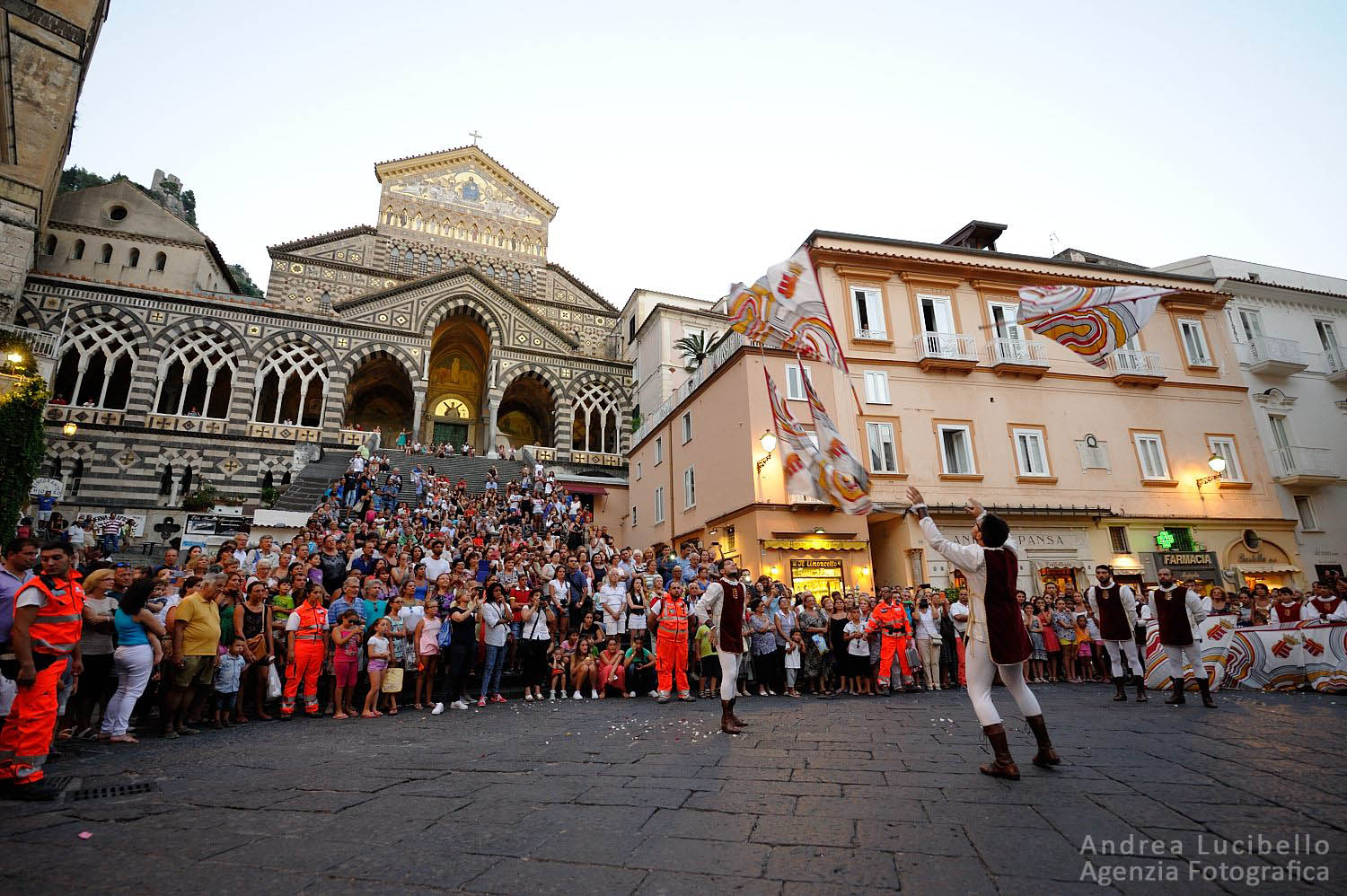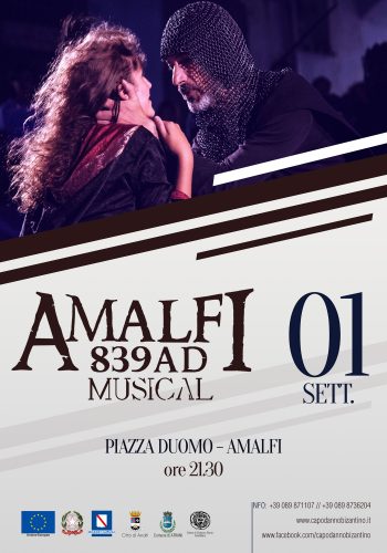 Venerdì primo settembre l’immersione nella storia della Repubblica Marinara è a tutto tondo. La rievocazione dell’elezione dei comites, che per un anno avrebbero guidato la città-stato marinara, e che viene attuata con la nomina del Magister di Civiltà Amalfitana, si unisce alla rievocazione scenica dell’Amalfi 839 A.D. Musical. Appositamente per la diciassettesima edizione del Capodanno Bizantino, il musical che narra in note e parole la nascita della Repubblica Marinara con la liberazione dal dominio del principe longobardo Sicardo, andrà in scena alle 21.30 in Piazza Duomo. In una versione rivisitata ed estesa.La scenografia monumentale del salotto della città sarà parte integrante dello spettacolo. Tra incontri, scontri e duelli, andrà in scena a tutto campo con effetti studiati per l’occasione, tra il colonnato della Cattedrale di Sant’Andrea, la scalea, il sagrato e piazza Duomo. Nelle stesse strade dove nell’anno 839 gli amalfitani sono scesi per liberarsi dal dominio longobardo, sarà proposta la rievocazione artistica ideata da Ario Avecone. Con scene inedite e nuovi personaggi, la romanzata storia d’amore tra Antonio e Giovanna sarà occasione per narrare la liberazione dalla tirannia e l’avvio di una delle più luminose pagine della storia della marineria italiana: quella della Repubblica Marinara. Molte le sorprese pensate per l’occasione, ma solo alcune vengono rese note: trenta nuovi attori in abito d’epoca si affiancheranno al cast stabile, in una versione ancor più dinamica del musical immersivo, che comprenderà anche alcune scene a cavallo.