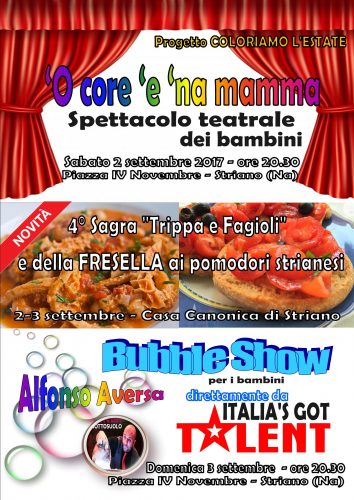 Il programma della manifestazione avrà inizio sabato 2 settembre 2017, alle ore 20.00 con l’apertura della 4° Sagra “Trippa e Fagioli”, l’evento culinario che riscopre gli antichi sapori. La storica pietanza della trippa sarà accompagnata quest’anno anche dalla fresella al pomodorino coltivato nelle splendide campagne strianesi.