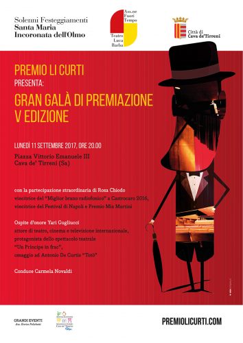 Si terrà lunedì 11 settembre 2017 a Cava de’ Tirreni (Sa), in Piazza Vittorio Emanuele III (meglio nota come Piazza Duomo), il Gran Galà di Premiazione della V edizione della Rassegna Teatrale “Premio Li Curti”, svoltasi dal 4 luglio al 12 luglio presso la Corte Rinascimentale di Casa Apicella. La serata, inserita nell’ambito dei “Solenni Festeggiamenti in onore di Santa Maria Incoronata dell’Olmo”, Celeste Patrona della città metelliana, avrà inizio alle ore 20.00.
