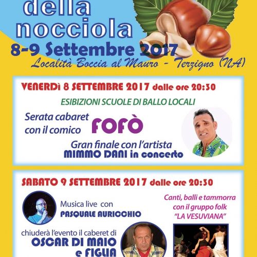 Tutto pronto a Terzigno per la prima edizione della “Sagra della nocciola”, evento a cura del Comitato Boccia al Mauro. Una “due giorni” di musica, sapori e spettacoli inizialmente prevista per il 2 ed il 3 settembre ma che poi, causa maltempo, è stata rinviata all’8 (venerdì) ed al 9 (sabato) settembre.