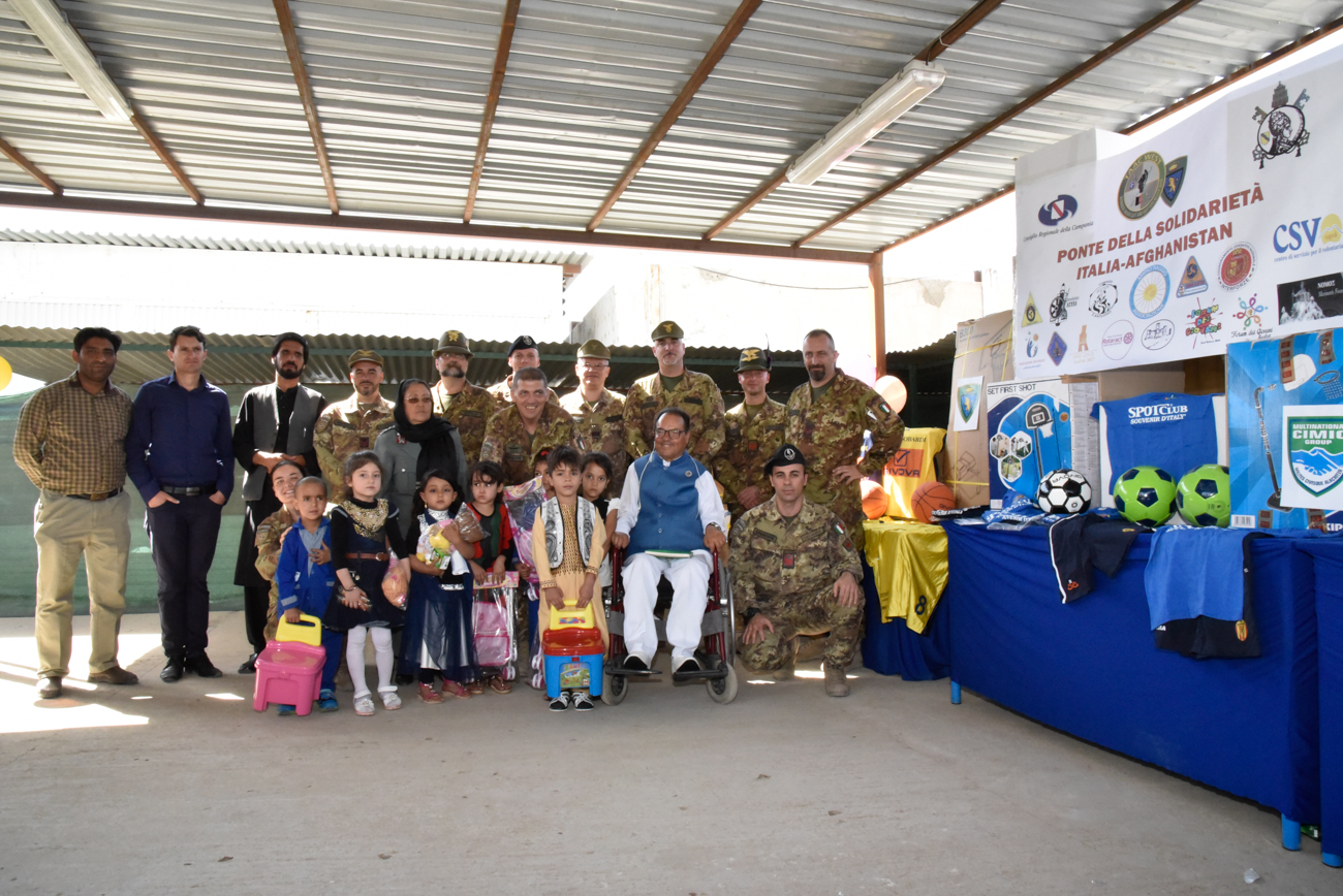 La cerimonia è stata organizzata dalla cellula di Cooperazione Civile e Militare del Train Advise Assist Command West (TAAC-W) su base Brigata alpina Taurinense, in presenza del Comandante Generale Massimo Biagini, veterano delle missioni in Mozambico, Bosnia ed Herzegovina, Kosovo, Afghanistan e Libano, insignito di numerose onorificenze, tra le quali Medaglia d’oro e Medaglia di Bronzo al Merito dell’Esercito, ha coordinato la donazione del materiale raccolto per un valore di circa 8.000 euro destinato ai piccoli bambini figli delle detenute del Carcere di Herat e ai disabili del centro ” PIR Herat Charity Foundation”. Con lo scopo di alleviare le sofferenze seconde a tali disagi, è stato donato loro materiale didattico, sportivo, una ludoteca e giochi lucidi creativi per i figli delle detenute di Herat; mentre canestri, palloni e completini da pallacanestro sono stati invece donati alla “PIR Herat Charity Foundation” in sostegno della squadra di basket in sedia a rotelle.