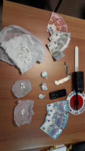 Scattata la perquisizione, nei polsini risvoltati della maglietta dell’uomo, gli agenti trovavano due ritagli di buste con all’interno, rispettivamente, quattro palline di cellophane contenenti polvere bianca, nella tasca dei pantaloni la somma di 130 euro in banconote di piccolo taglio ed un telefono cellulare.